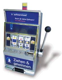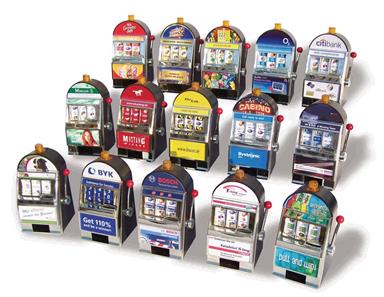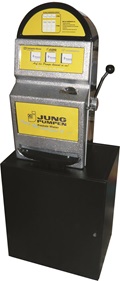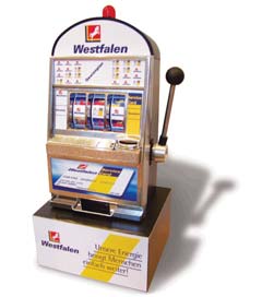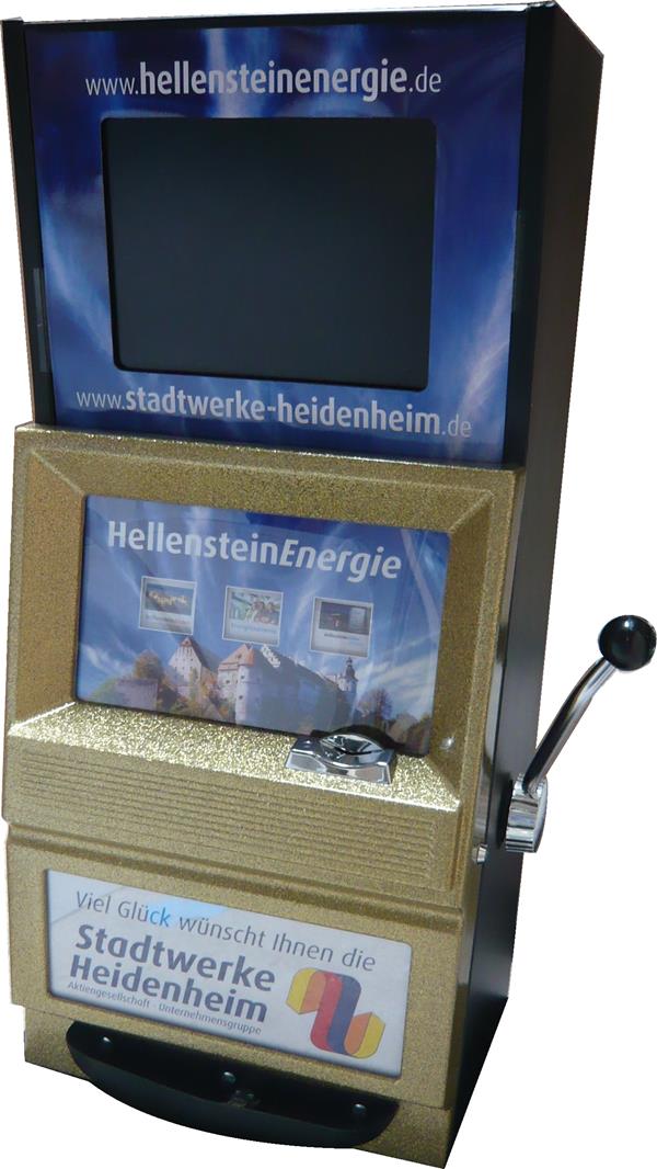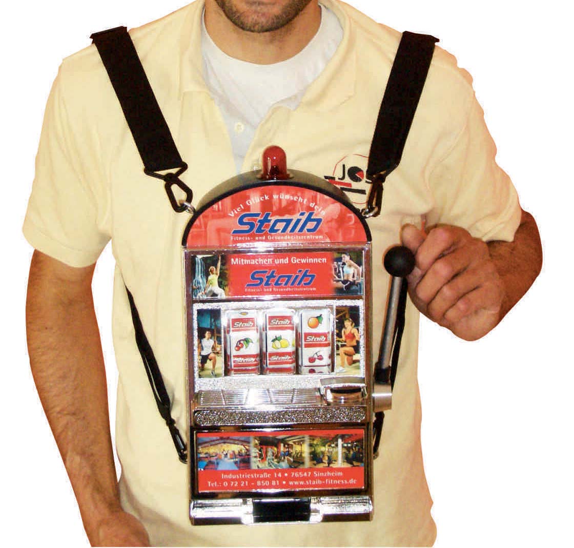 Unsere Slotmaschine "Reno" und "Laughlin. Eine Größe für fast alle Einsatzaktivitäten. Für den Einsatz im Shop, direkt neben der Kasse, dem kleinen Infostand, wo jeder Zentimeter zählt oder als "Bauchladen" für eine mobile Promotionaktion durch die Gastronomie oder in Fußgängerzonen - das perfekte Gerät. Die Slotmaschinen arbeiten rein mechanisch und benötigen lediglich für die Klingel und die Blinkleuchte zwei Mignon Batterien. Wir bieten für diese Geräte umfangreiche Sonderausstattungen, wie zum Beispiel ein zusätzliches Holzpodest, einen Aluminiumhebel mit Dämpfungspuffer oder eine Rucksackversion, die einen Einsatz sogar direkt auf der "Piste" möglich machen. Wir beraten Sie gerne.