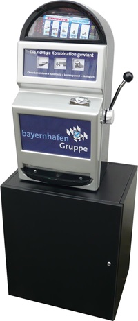 Unsere zweit größte Slotmachine "basic 4.0". Das Maximum an technischen Möglichkeiten in der Form der klassichen Slot Machine. Bei der Steuerung Version 4.0 sind jetzt 2 bis 12 verschiedene Logo-Kombinationen pro Walze möglich. Der Betrieb erfolgt wahlweise mit Werbemünzen (Token) oder per Freispiel. Die Gewinnsteuerung ist programmierbar. So wird eine Veranstaltung zu einer planbaren Größe, denn Sie können bestimmen, wie oft welcher Preis kommen soll. Ausgabetools im Gerät ermöglichen den automatischen Auswurf von unterschiedlichen Gewinnchips oder auch kleiner Warenproben, Kreditkarten oder Gutscheinen. Weitere Optionen sind ein Soundmodul mit Verstärker oder ein Anschluß an externe Ausgabegeräte. Hiermit können z.B. Blitzleuchte, Fotokamera oder eines Ihrer Produkte aktiviert werden. Sie merken, dieses neuartige Marketingmodul kann viel - viel mehr, als wir hier aufführen können. Lassen Sie uns doch gemeinsam ein passendes Konzept erarbeiten.